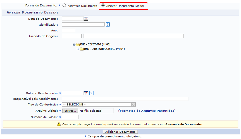 Ao optar pela Forma do Documento Anexar Documento Digital, a página será exibida na formatação abaixo:
