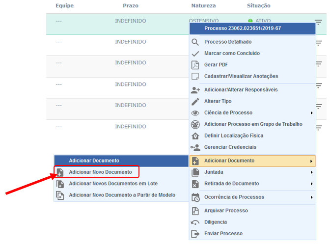 Ao clicar no ícone, o Sistema apresentará as opções de operação a serem realizadas no processo, conforme a tela a seguir. Caminhe com o cursor até a opção Adicionar Documento.
