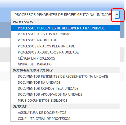 No campo PROCESSOS, selecionar a opção Processos na Unidade.