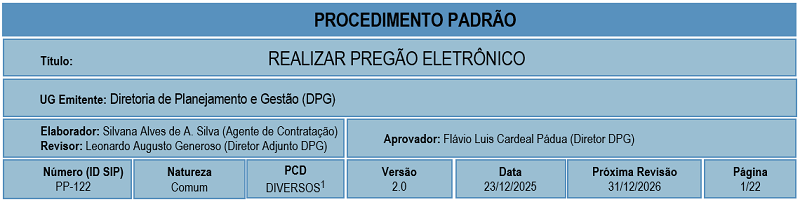 Este procedimento padrão tem como objetivo descrever as etapas e responsabilidades, no âmbito do CEFET-MG, para se adquirir bens e contratação de serviços comuns através do processo licitatório denominado “pregão eletrônico”, com a negociação ocorrendo exclusivamente pela internet.